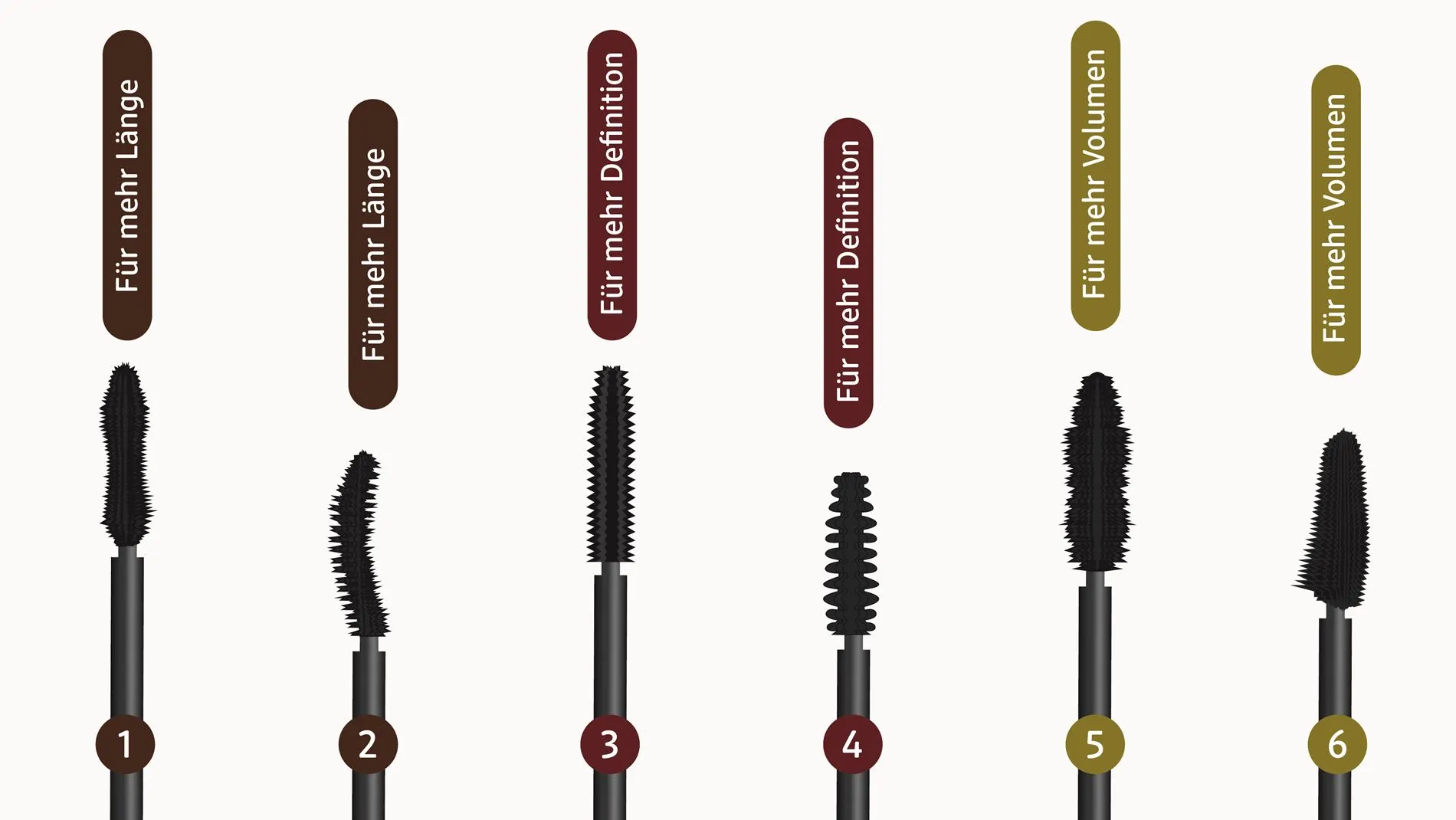 Je nachdem, ob Volumen, Länge oder Definition im Vordergrund stehen sollen, lohnt es sich, auf eine passende Formel und Bürstenform zu achten.- Volumen: Dickere, buschige Bürsten.