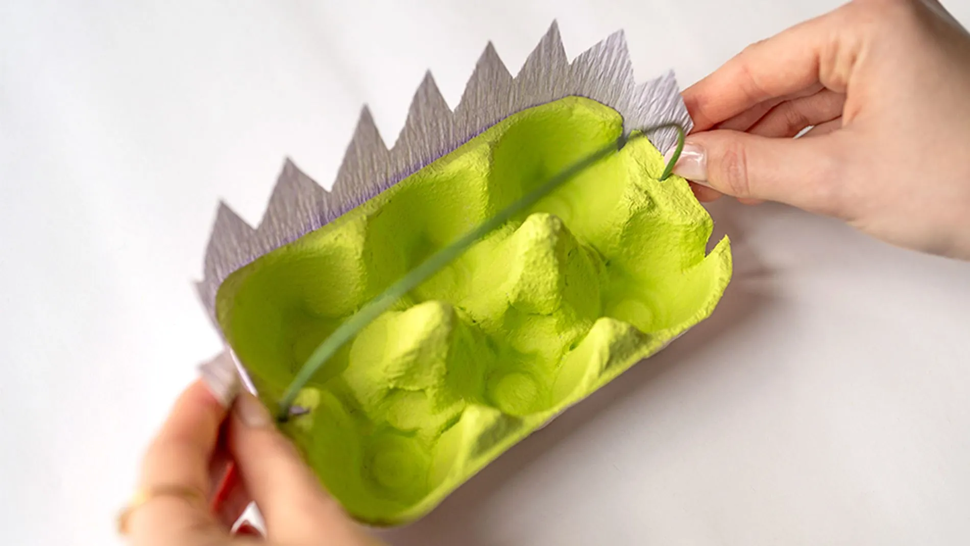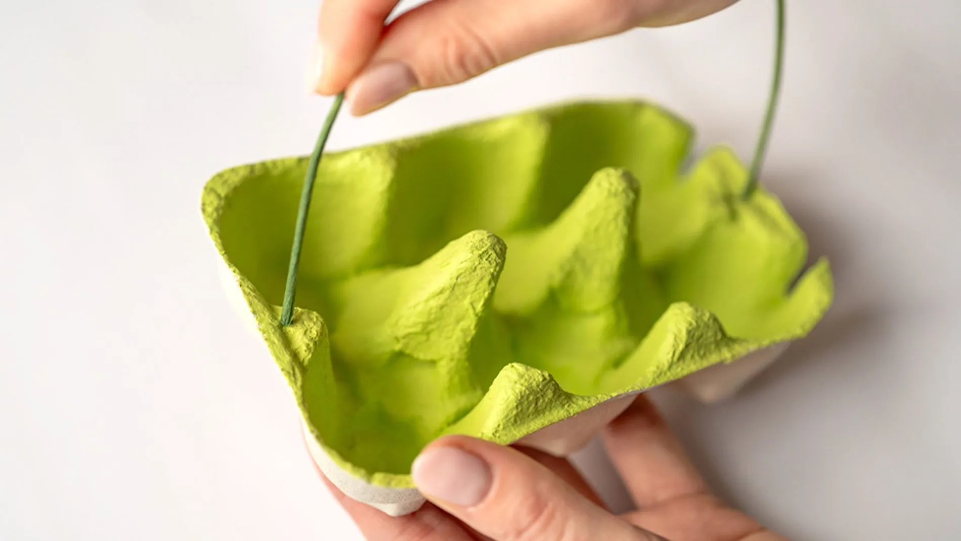 2. Wenn die Farbe getrocknet ist, den Draht durch ein kleines Loch an den beiden Enden des Eierkartons stechen und festdrahten. So entsteht der Henkel.