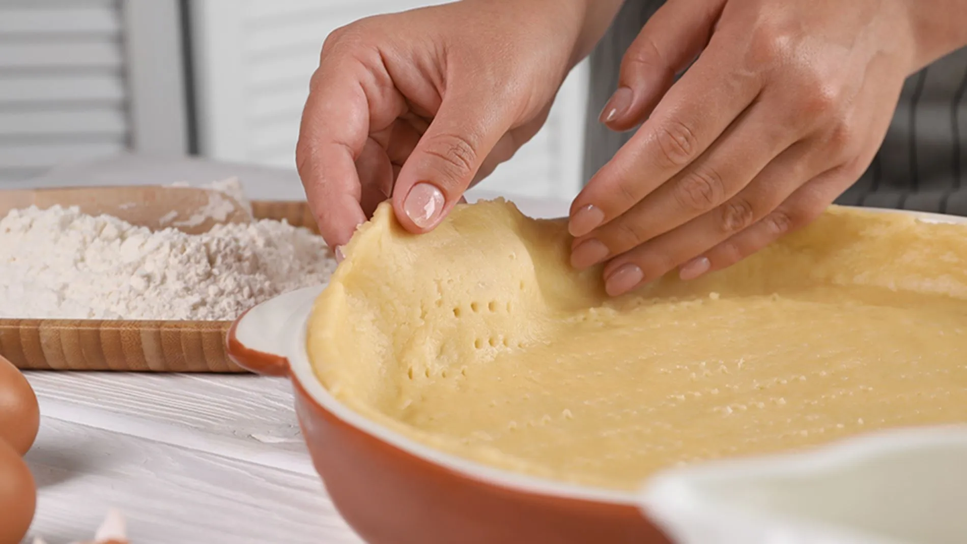 2. Den Teig in eine gefettete Form drücken, den Boden mehrfach einstechen und 10 Min. bei 180 °C Ober-/Unterhitze vorbacken.